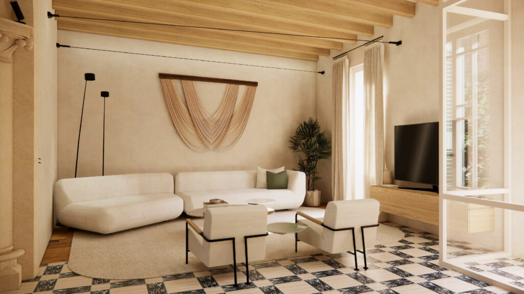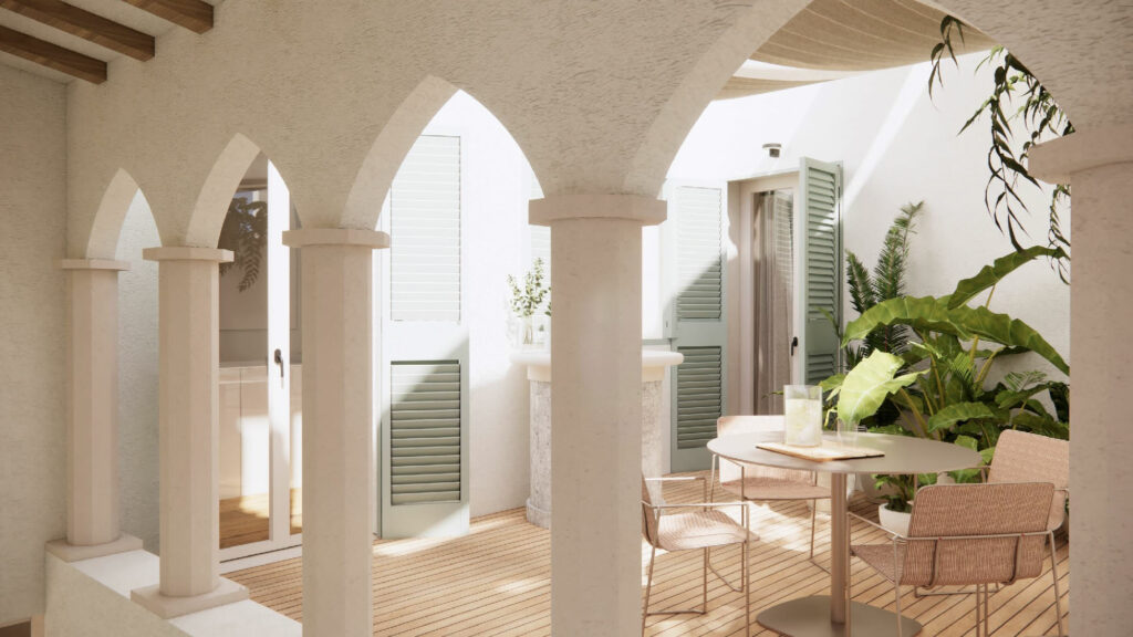The interiors reflect a flawless fusion of heritage and contemporary minimalism. Bathrooms feature polished plaster and Mallorcan stone basins, combined with Icónico fixtures and bespoke mirrors. A sophisticated palette of white, sand, brass, oak, and steel creates a harmonious dialogue of noble materials and modern aesthetics.